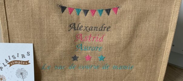 Article brodé à la commande, il est composé de fanions en hauts du sac et de 3 étoiles après les prénoms.