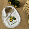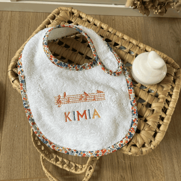 Ce bavoir premier âge est en éponge et un biais y est cousu tout le tour. Il est fermé par un scratch.