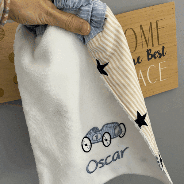 Ce grand bavoir est composé d’un coté en éponge oeko tex pour la broderie et un côté en coton pour le dos du bavoir.