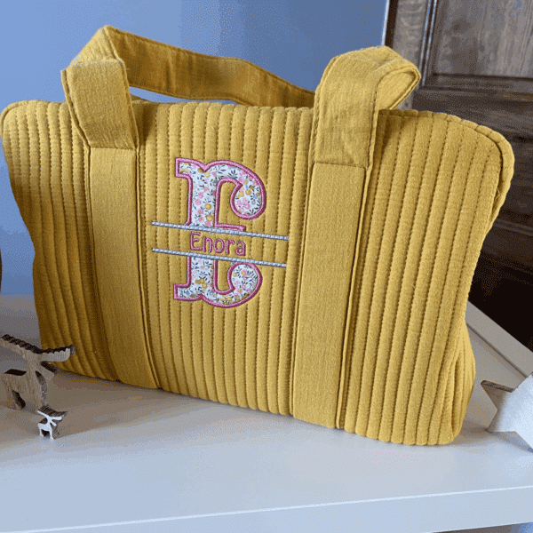 Ce sac pour y glisser le nécessaire de bébé en vadrouille. Personnalisé avec une lettrine.