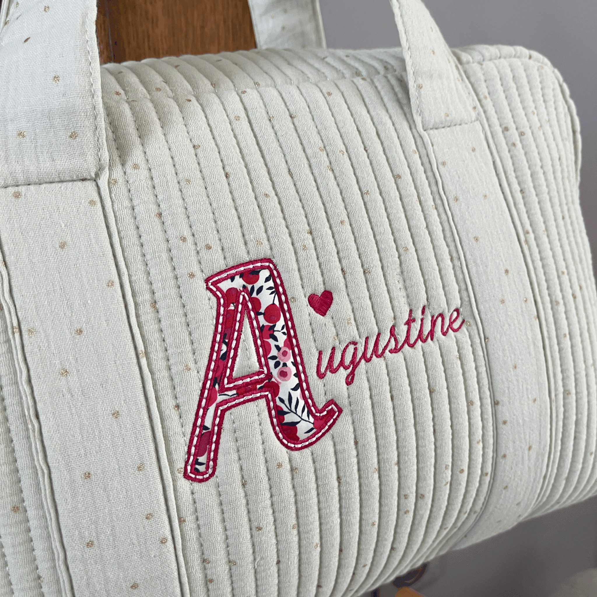 Ce sac pour y glisser le nécessaire de bébé en vadrouille. Personnalisé avec une lettrine.